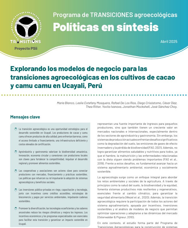 Explorando los modelos de negocio para las transiciones agroecológicas en los cultivos de cacao y camu camu en Ucayali, Perú